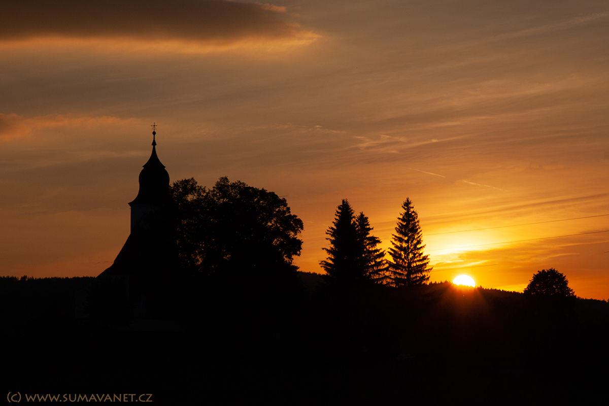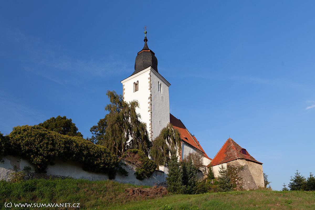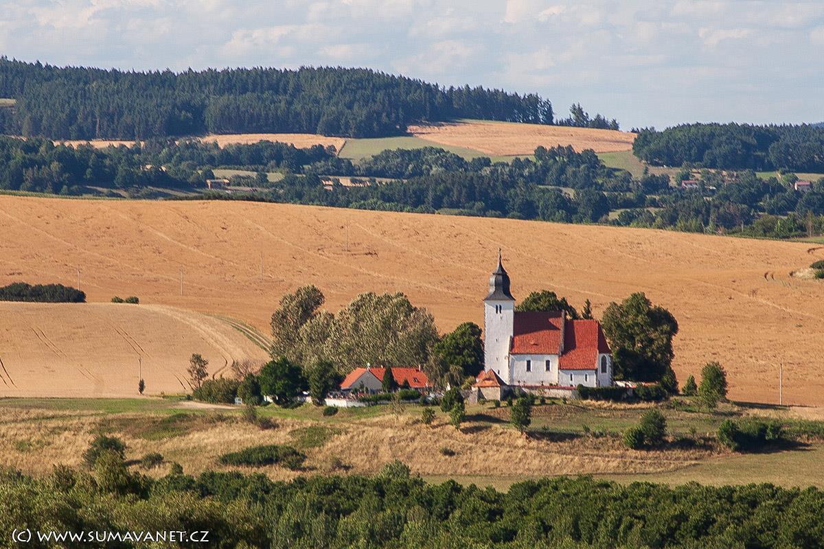 „Od poslední chalupy ve vsi už vidíme románskou věž zdouňského kostelíčka svatého Vavřince, který sám jediný zůstal z celé osady, zaniklé v třicetiletých válkách. Lidová pověst mu přisoudila jednu mši, kterou prý zde dal sloužiti Jan Žižka, když táhl od Velhartic na Rábí.