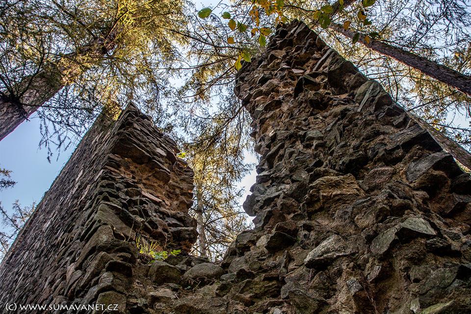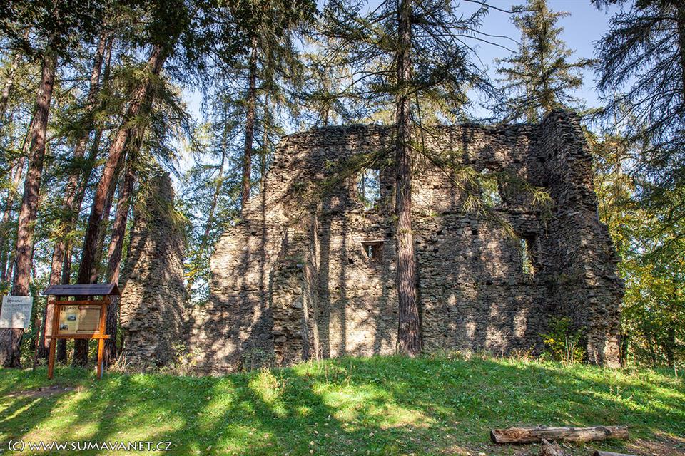 Z tvrze se dochovaly zbytky obvodového zdiva (severní strana) hlavní podsklepené budovy, která mívala obdélníkový půdorys s rozměry 22 × 7,5 metru. Případné opevnění beze stop zaniklo. Stavení bylo čtyřhranné a dvoupatrové a nebylo obehnáno příkopem. V prvním patře paláce se nacházel středový sál, který měl po stranách dvě světnice s prevéty. Ve druhém patře býval velký sál a na západní straně menší místnost s krbem. Sál měl vlastní prevét v severní zdi a osvětlovalo jej velké okno se sedátky. V oknech se dochovaly dřevěné překlady.Kdy a kým byla tvrz založena, není známo. Roku 1234 se připomíná jako majitel tvrze Zdeslav. Ve 14. století nepochybně patřila tvrz pánům Velhartickým. Je pravděpodobné, že tvrz byla využívána pouze jako lovecký nebo strážní hrádek. Roku 1428 prodal Oldřich z Rožmberka Menhartovi z Hradce 30 vesnic v okolí Velhartic a mezi nimi také Kašovice. Když si roku 1565 vkládal Jan Rendl z Úšavy do zemských desek zápis o svém nově zakoupeném majetku v Kašovicích, byla tvrz již vedena jako pustá. Jan Rendl prodal Kašovice ještě téhož roku Václavovi Vintíři z Vlkonic a na Kolinci.